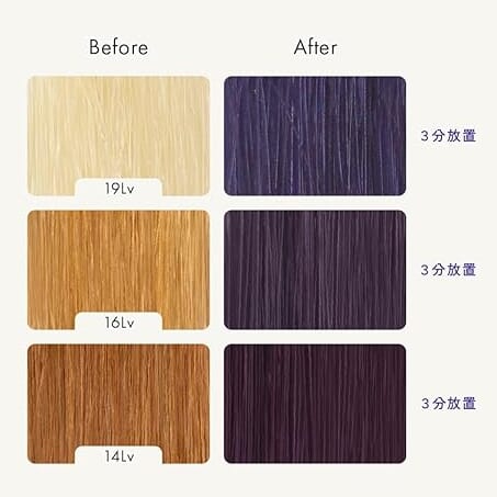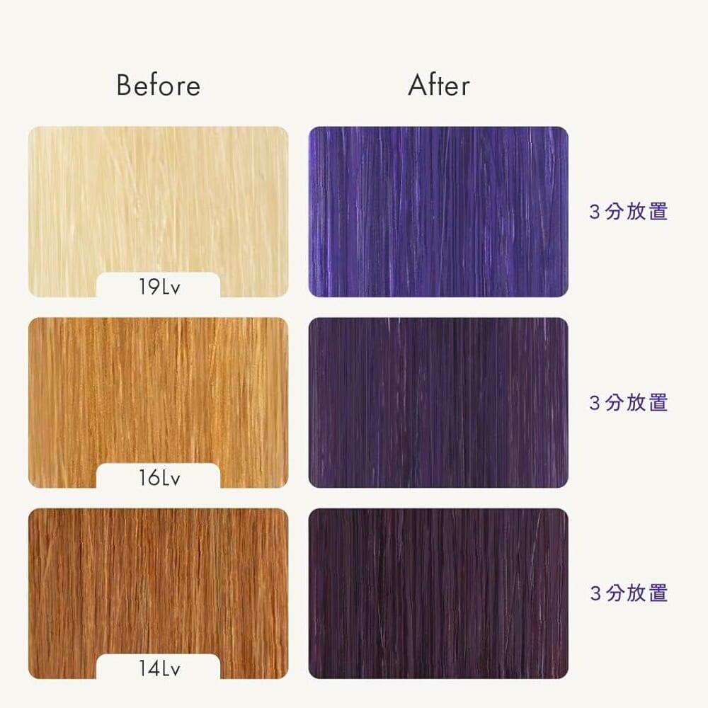 19レベルのハイトーンヘアに使用するとクリアで鮮やかな紫色に染まり、茶髪に使用すると温かみのある赤紫になります。