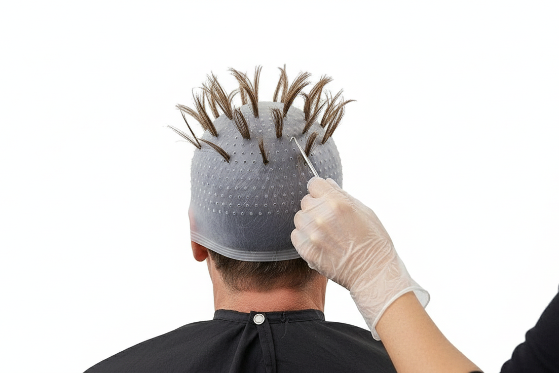 - 髪を引き出す 付属のかぎ針を使って、キャップの穴から染めたい部分の毛束を少量ずつ引き出します。